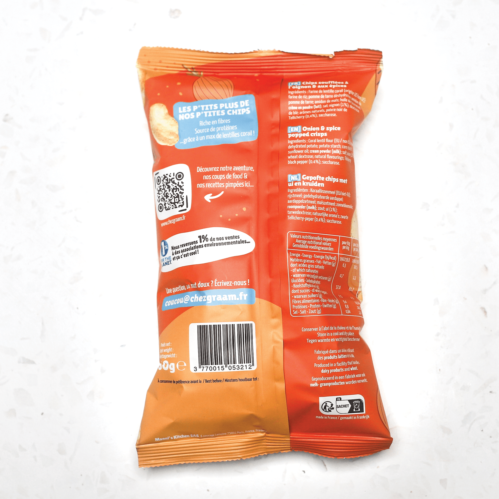 Liste des ingrédients pimpés : Farine de lentille corail, farine de riz, pomme de terre déshydratée, amidon de pomme de terre, amidon de maïs , huile de tournesol, crème en poudre (lait), sel, oignon (1%), dextrose de blé, arômes naturels, poivre noir Tellicherry (0,4%), saccharose.