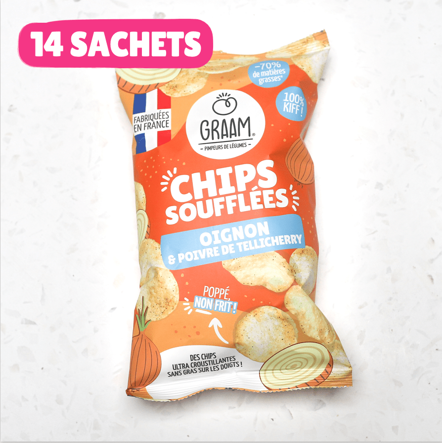 Pour un apéro pimpé, laissez-vous tenter par nos chips soufflées… Oignon & poivre de tellicherry. Cette association, dosée au gra(a)mme près, c'est un pur KIFF ! Supplément : ultra croustillantes, avec un caractère bien trempé. Les testeurs, c'est les adoptants…mais à déguster loin d'un tête-à-tête rapproché !
