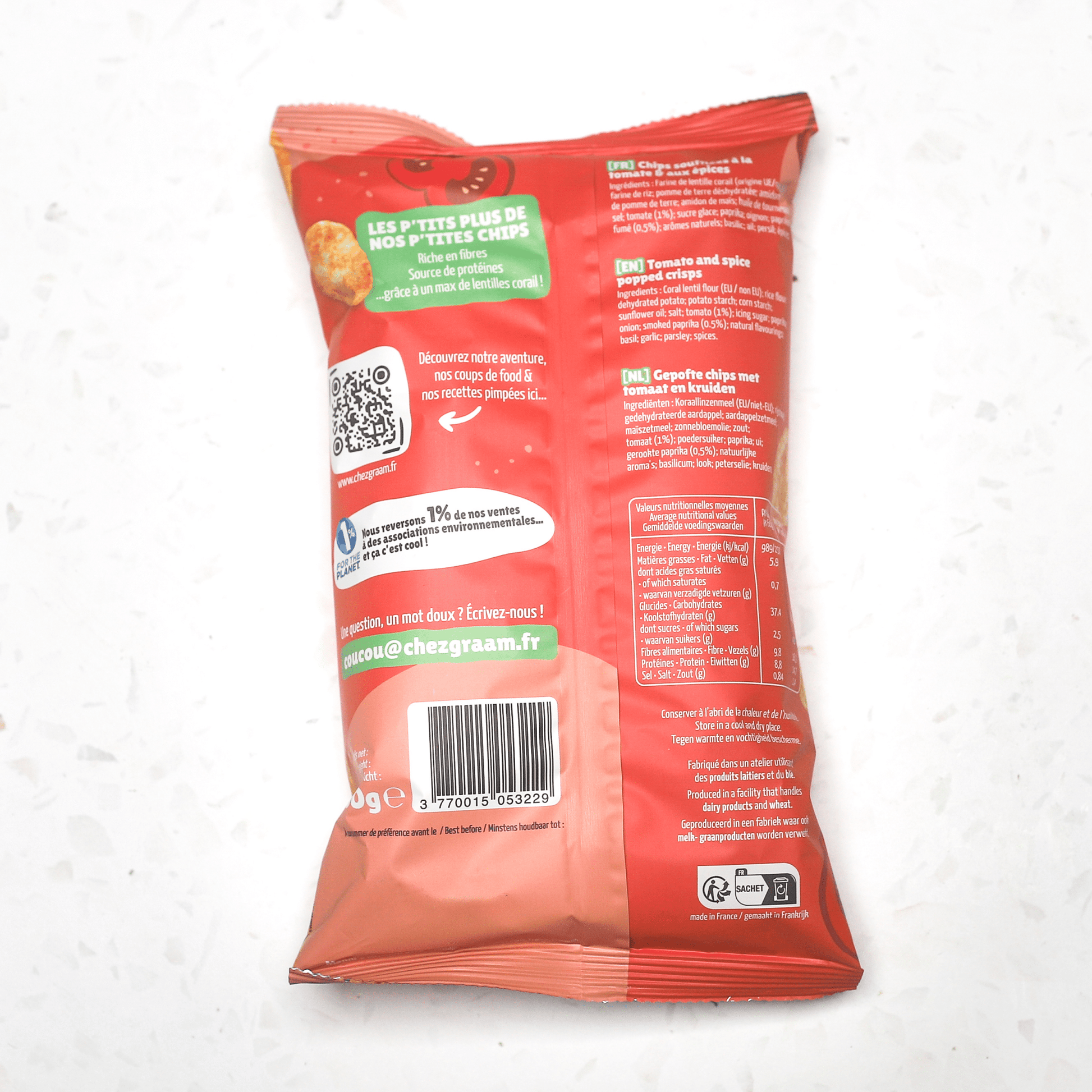 Farine de lentille corail, farine de riz, pomme de terre déshydratée, amidon de pomme de terre, amidon de maïs , huile de tournesol, sel, tomate (1%), sucre glace, paprika, oignon, paprika fumé (0,5%), arômes naturels, basilic, ail, persil, épices.