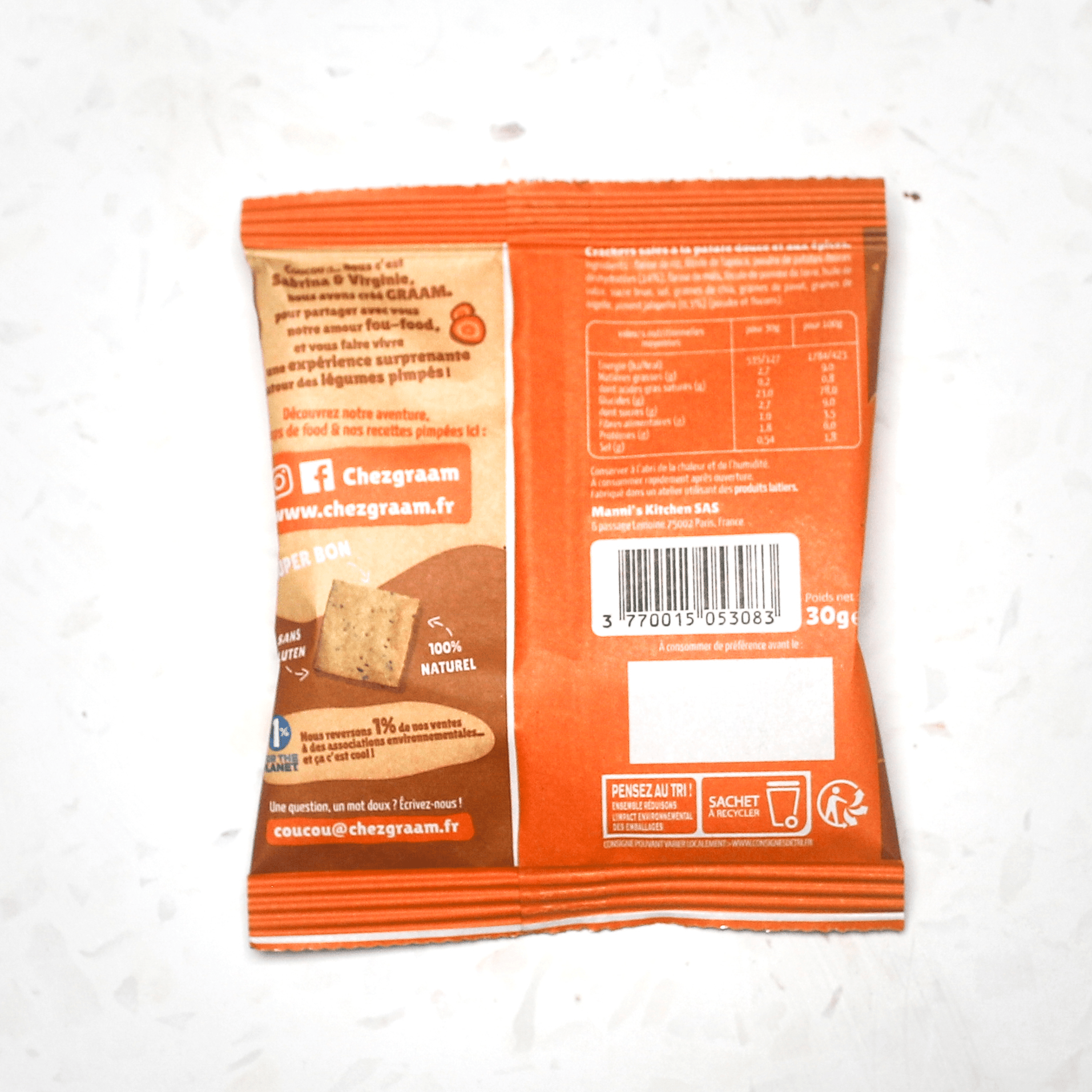 Farine de riz, fécule de tapioca, poudre de patates douces déshydratées (14%), farine de maïs, fécule de pomme de terre, huile de colza, sucre brun, sel, graines de chia, graines de pavot, graines de nigelle, piment jalapeño (poudre et flocons) (0,3%).